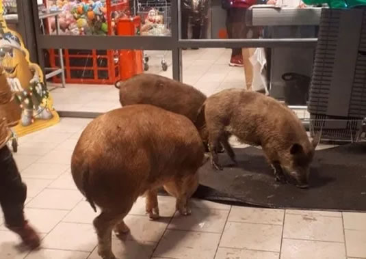 Drie uitgebroken varkens zetten een supermarkt in Siberië op stelten en breken flessen cognac om zich te laven. Klik hier voor video.